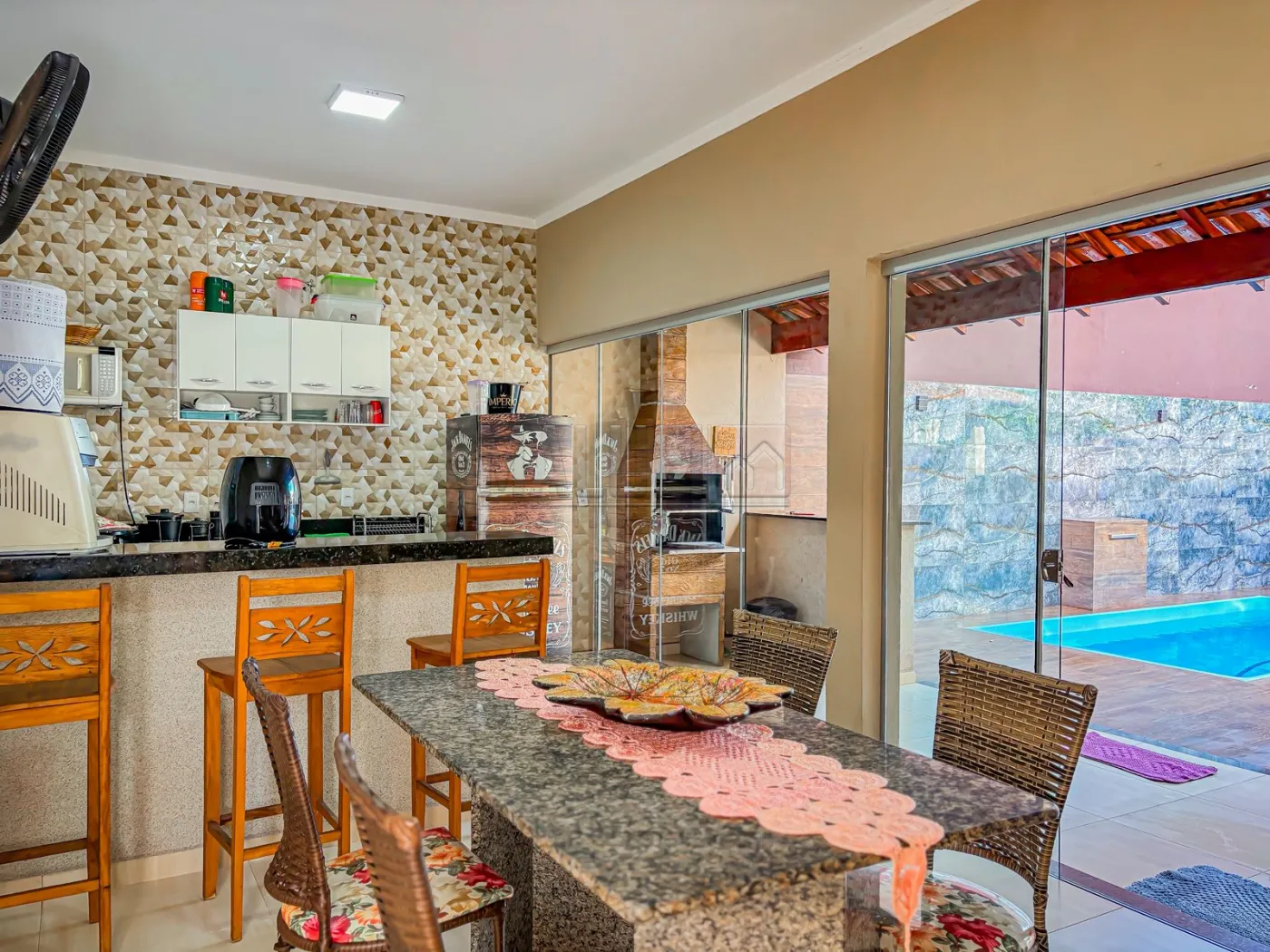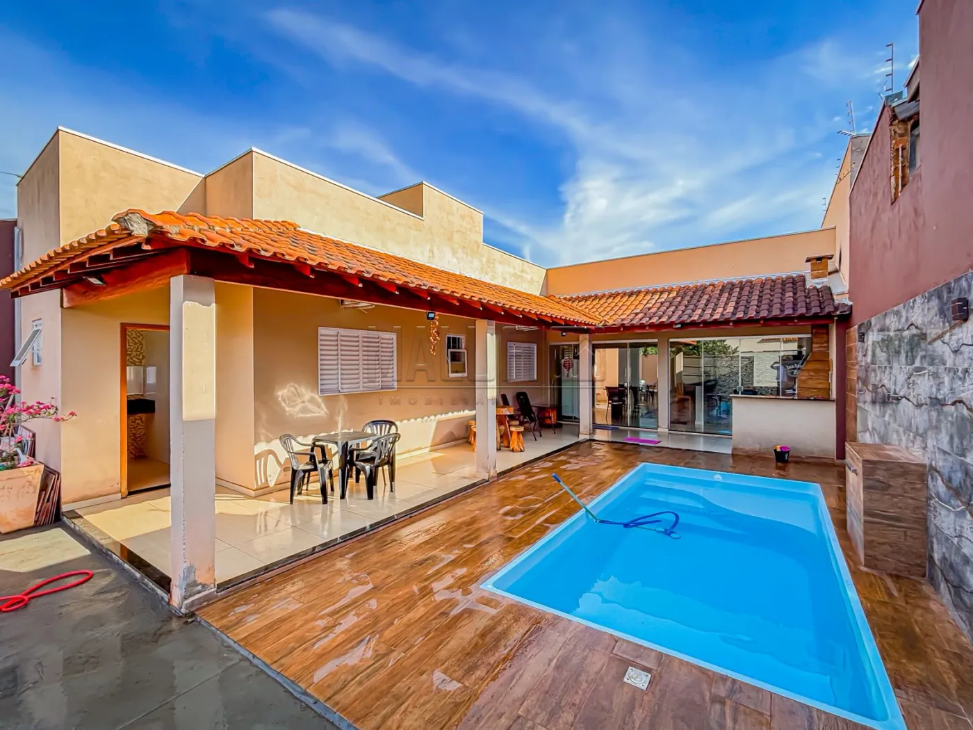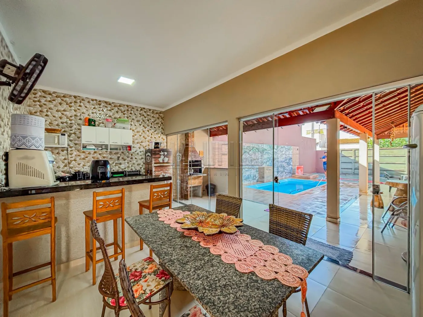 Excelente imóvel residencial completamente mobiliado e com ótima localização em bairro privilegiado e próximo a uma das entradas principais da cidade, dispondo de: 02 quartos, wc social interno e externo, ampla sala de tv, sala de jantar integrada c/ a cozinha, área gourmet c/ churrasqueira, ampla piscina, área de serviço coberta e garagem para 02 carros.