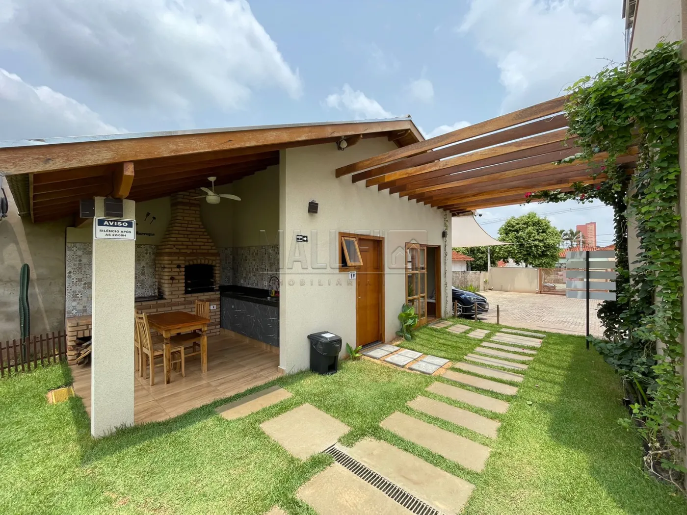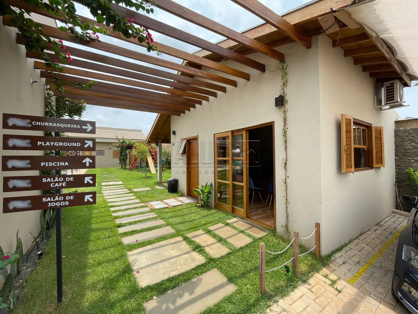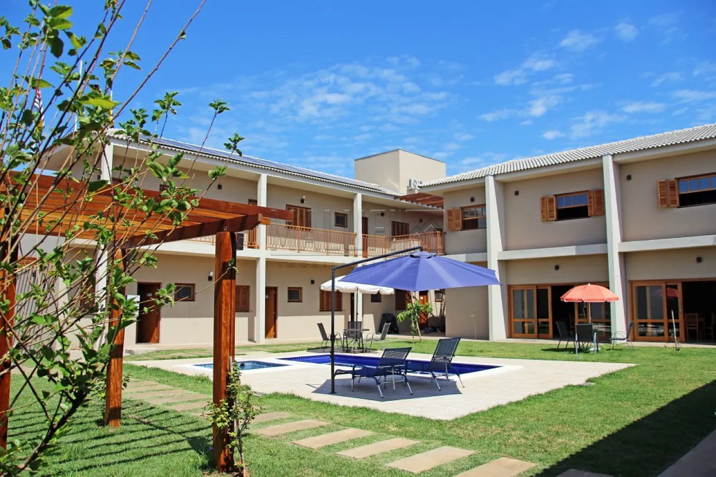 Áreas externas: 2 piscinas aquecidas IGUI linha Cerâmica (revestidas de pastilhas Atlas), com deck, espreguiçadeiras, ombrelones, mesas e cadeiras; 1 playground em madeira; 1 churrasqueira com fogão à lenha, mesa e cadeiras, armários, balcão e pia; 450 mts de pátio com grama, pergolado com banco e árvores frutíferas e 1 Estacionamento para 12 veículos.