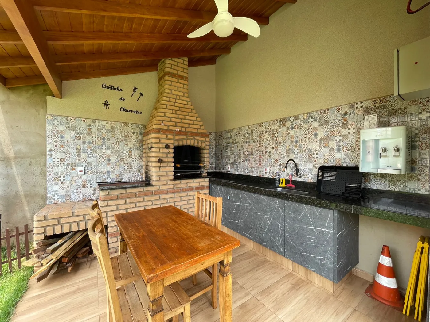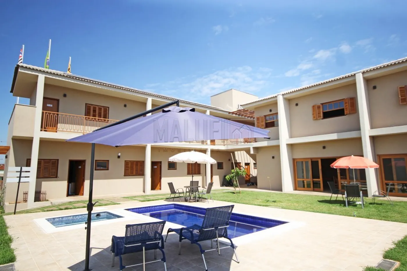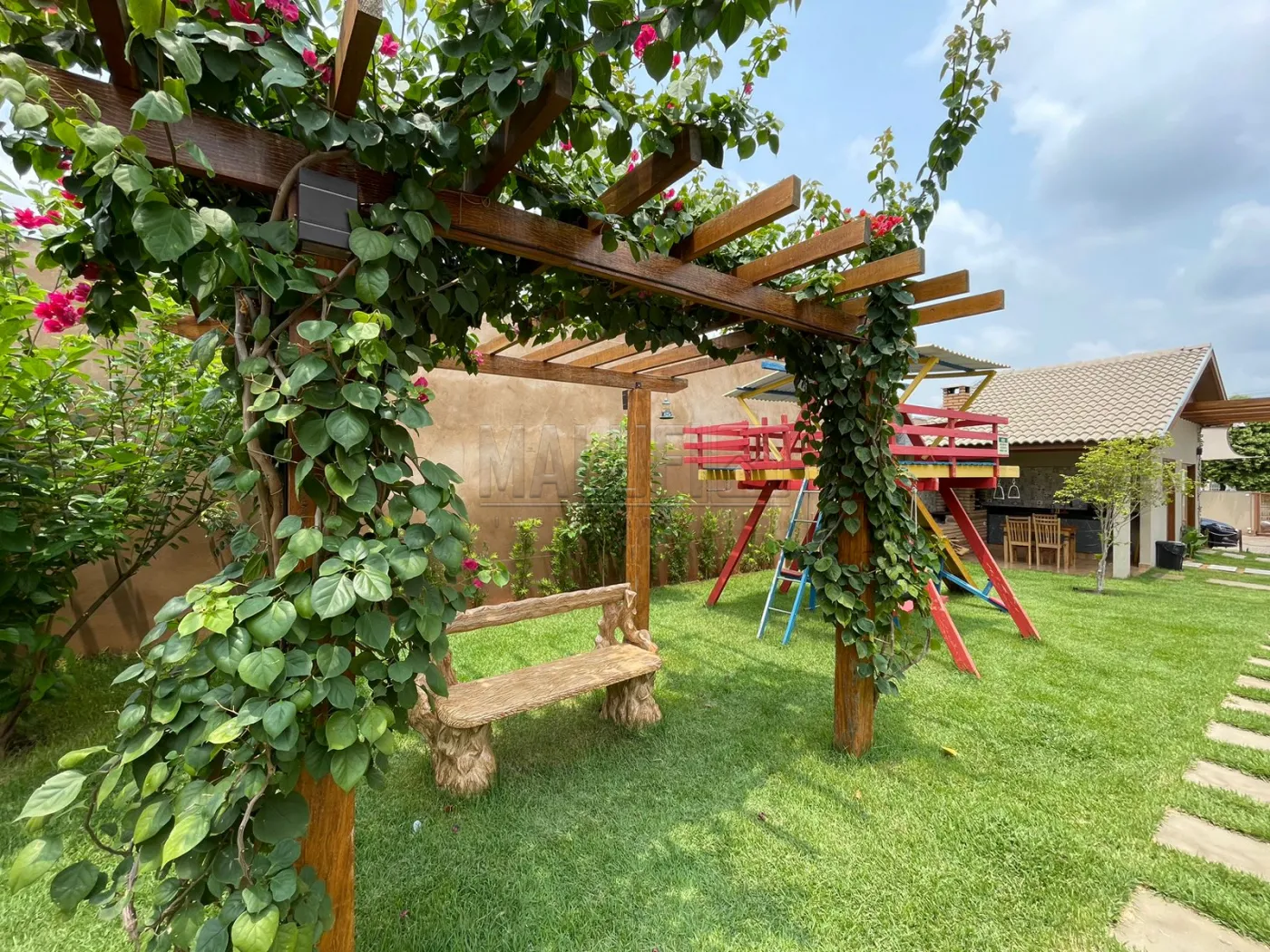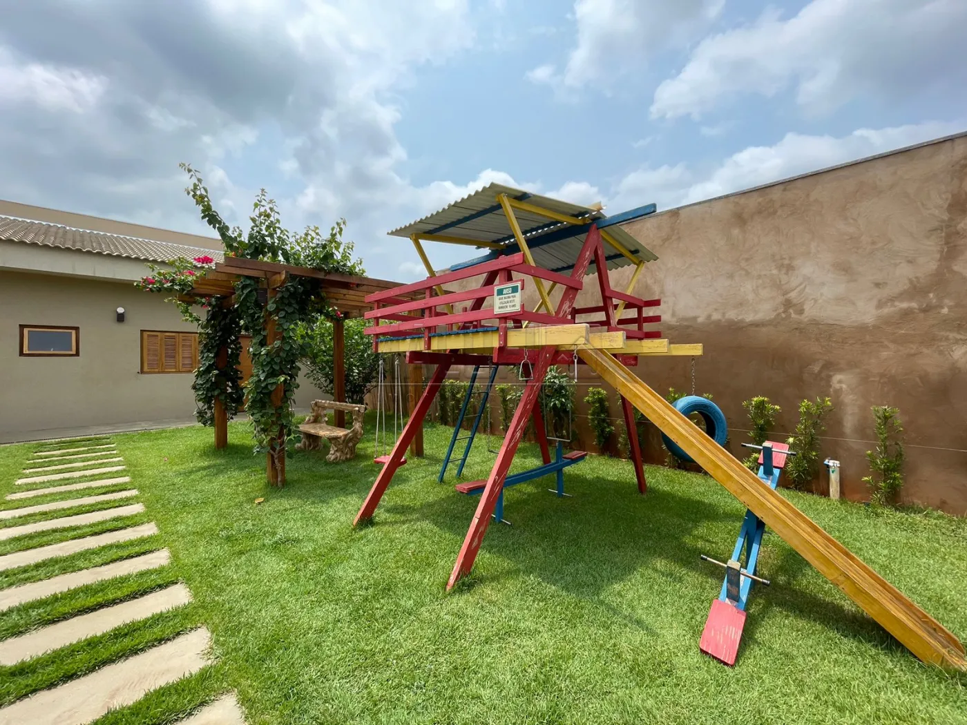 Áreas externas: 2 piscinas aquecidas IGUI linha Cerâmica (revestidas de pastilhas Atlas), com deck, espreguiçadeiras, ombrelones, mesas e cadeiras; 1 playground em madeira; 1 churrasqueira com fogão à lenha, mesa e cadeiras, armários, balcão e pia; 450 mts de pátio com grama, pergolado com banco e árvores frutíferas e 1 Estacionamento para 12 veículos.
