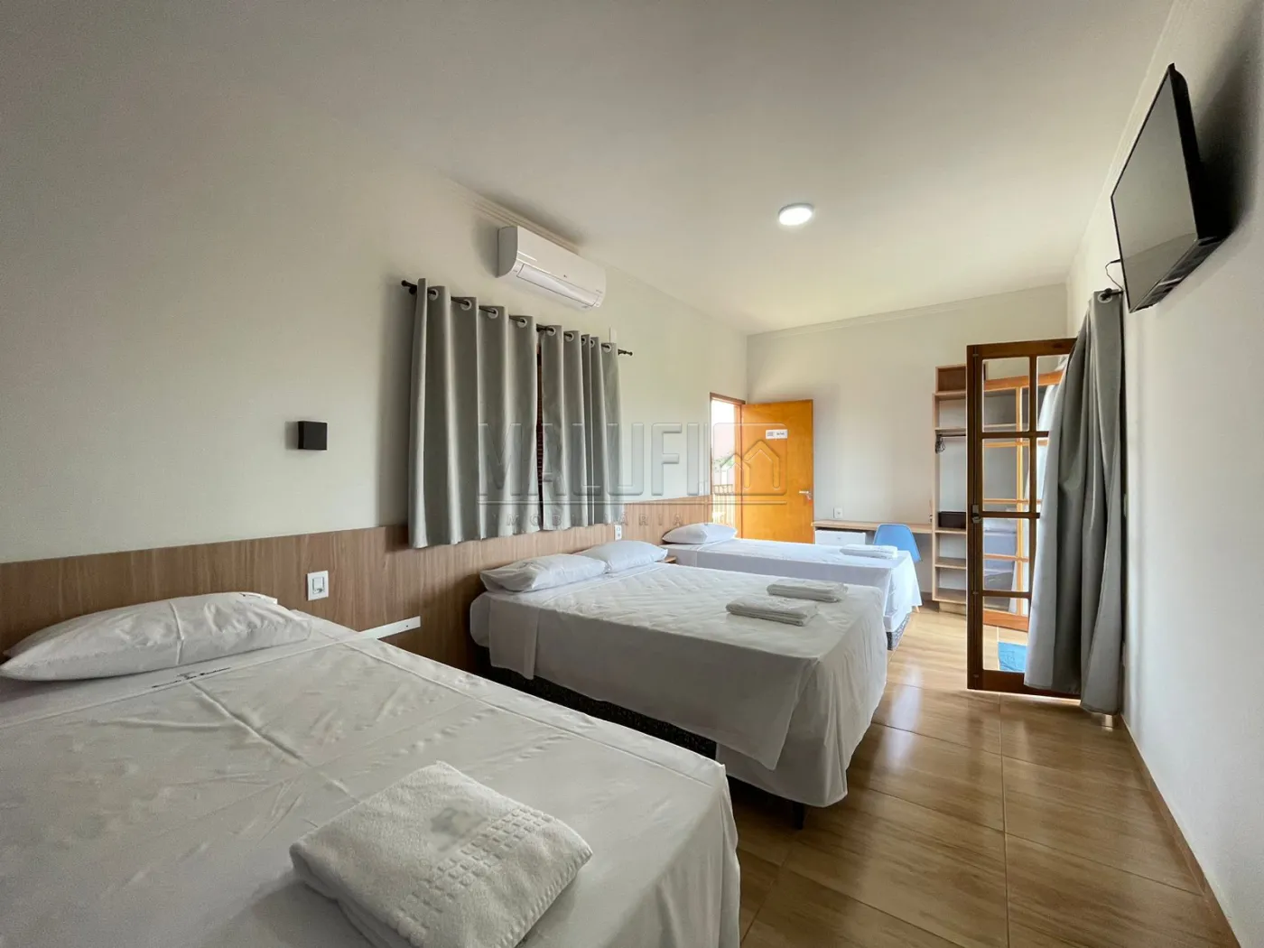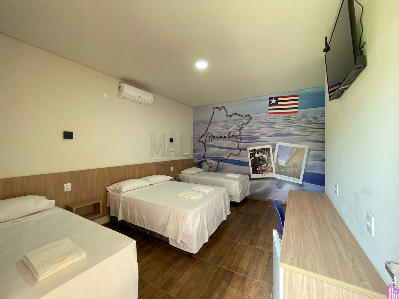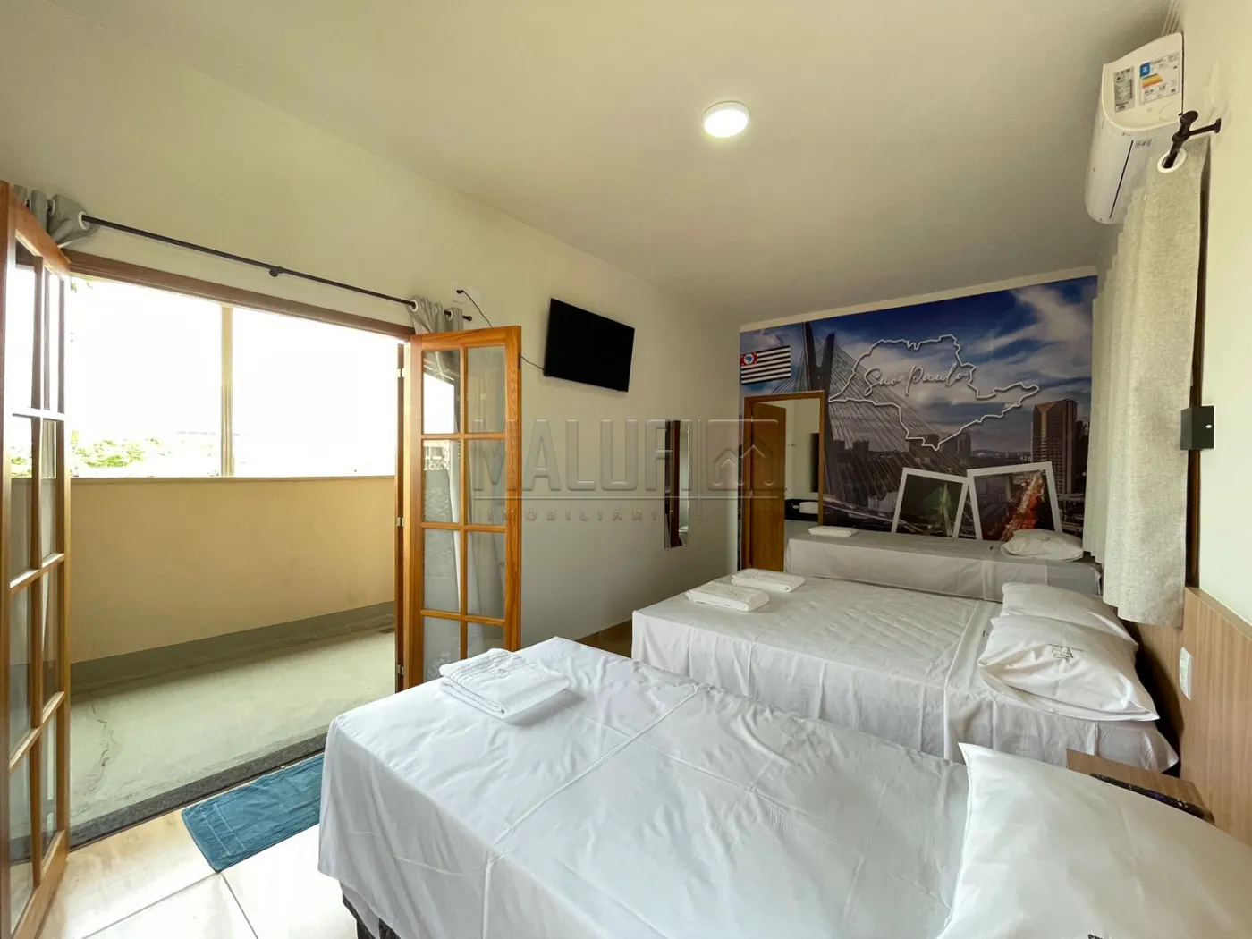 - 1 Quarto Triplo com varanda, piso superior, 27m², equipados com 1 cama casal, 2 camas solteiro, linha hotel Orthobom, frigobar, ar condicionado LG Inverter Wifi, Smart TV 40`, mesa e cadeira de trabalho, roupas de cama e banho linha profissional Teka, banheiro com box, ducha pressurizada, espelhos de corpo e rosto.